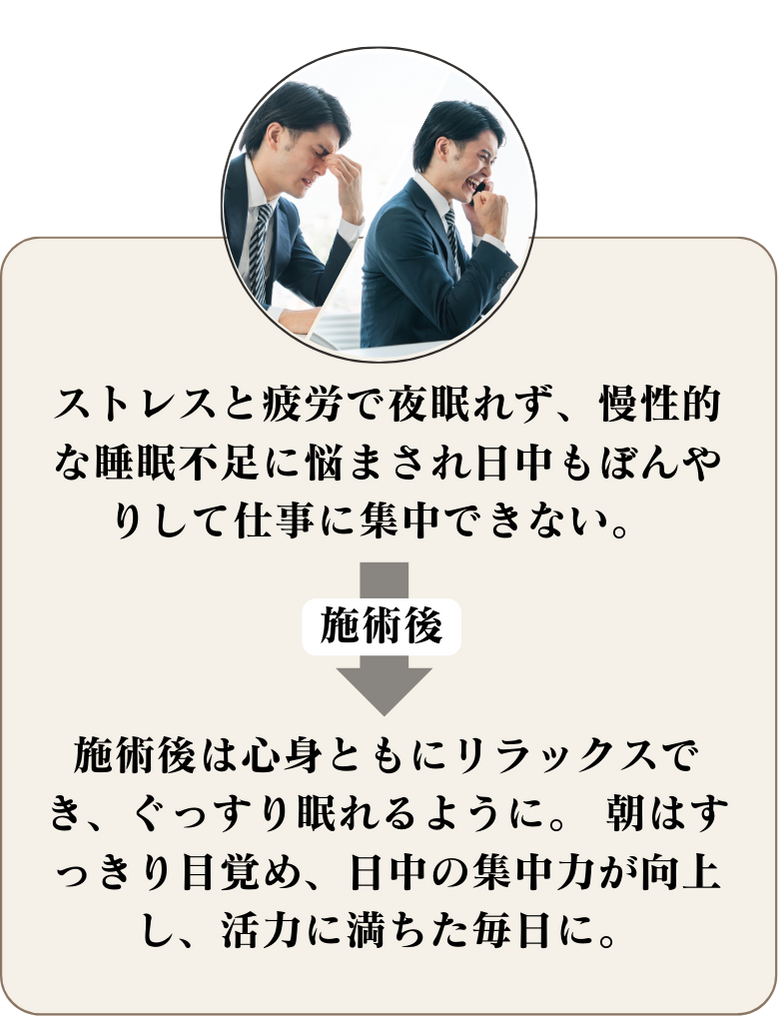 表層から深部にまで働きかける施術であなたの体を根本から変える究極の再生プログラムです。継続することで病気になりにくく疲れが溜まりにくい身体を作ることが出来ます。 具体的には以下の効果が期待できます。